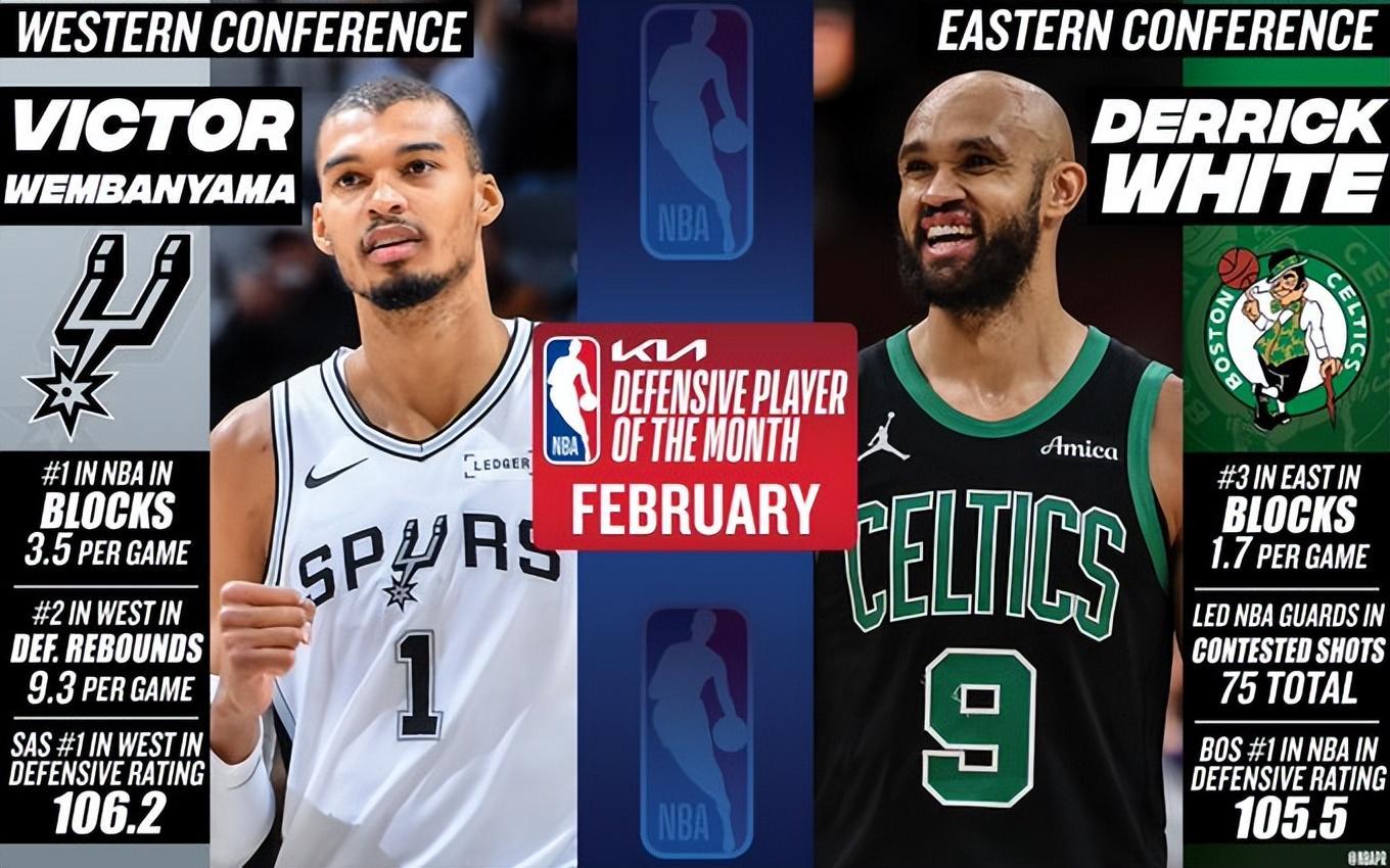 文班亚马当选2月西部月最佳防守球员,凯尔特人后卫德里克-怀特则斩获2月东部月最佳防守球员。